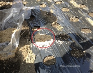 で、蒔き終えたら、その上に籾殻を被せていきます。(上記画像の赤丸の部分)
