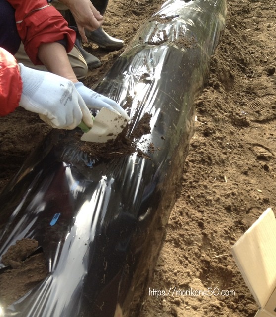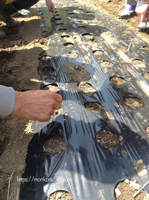 黒いマルチの丸くくり抜かれた場所に人参の種を蒔いていくのですが、上記画像は、「軍曹殿」と呼ばれている山崎さんが教えてくれている様子です。