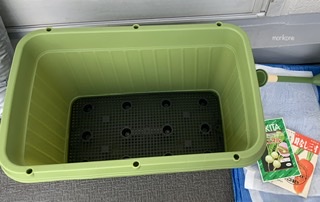しかし、上記画像のプランターは、底付近に水抜き穴が空いており、今回の無肥料栽培では使わない黒いネット付きです。