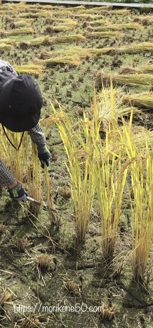 で、ちょっとヤラセっぽいんですが、下記画像は稲をカマで刈り取っている様子です。(てか、完全にヤラセです^^;)