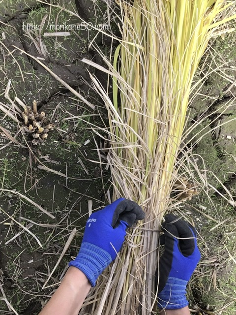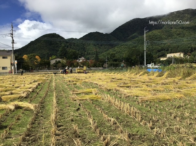田んぼのあちらこちらに、結束された稲が散らばっていますが、この結束も、稲を刈り取ると同時に機械でやってくれるそう。(たぶん、そう聞いたような・・・)