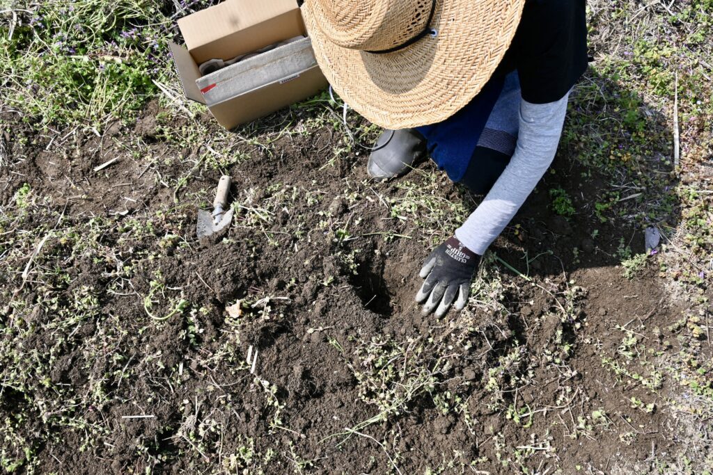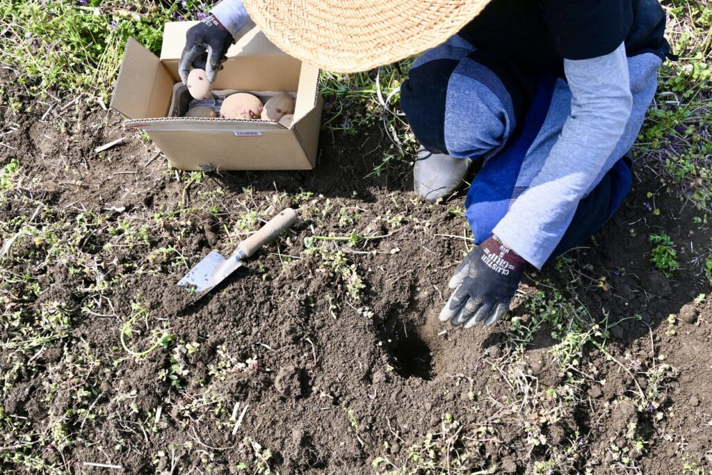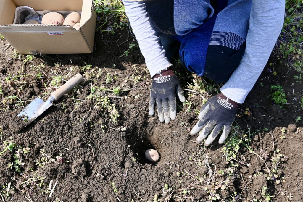 そして、なんとなーく畝ができたので、穴を掘って種イモを植えていきます。