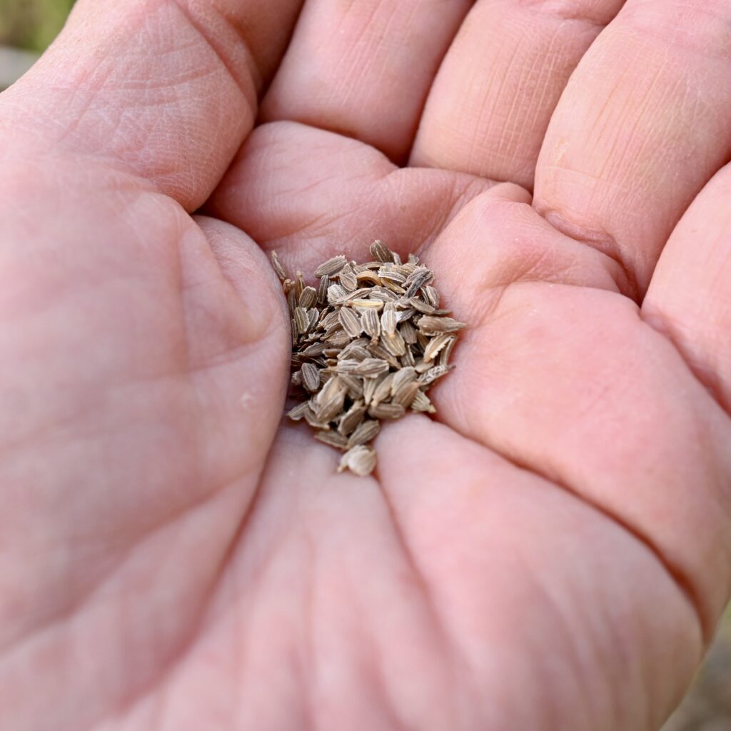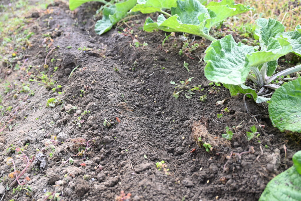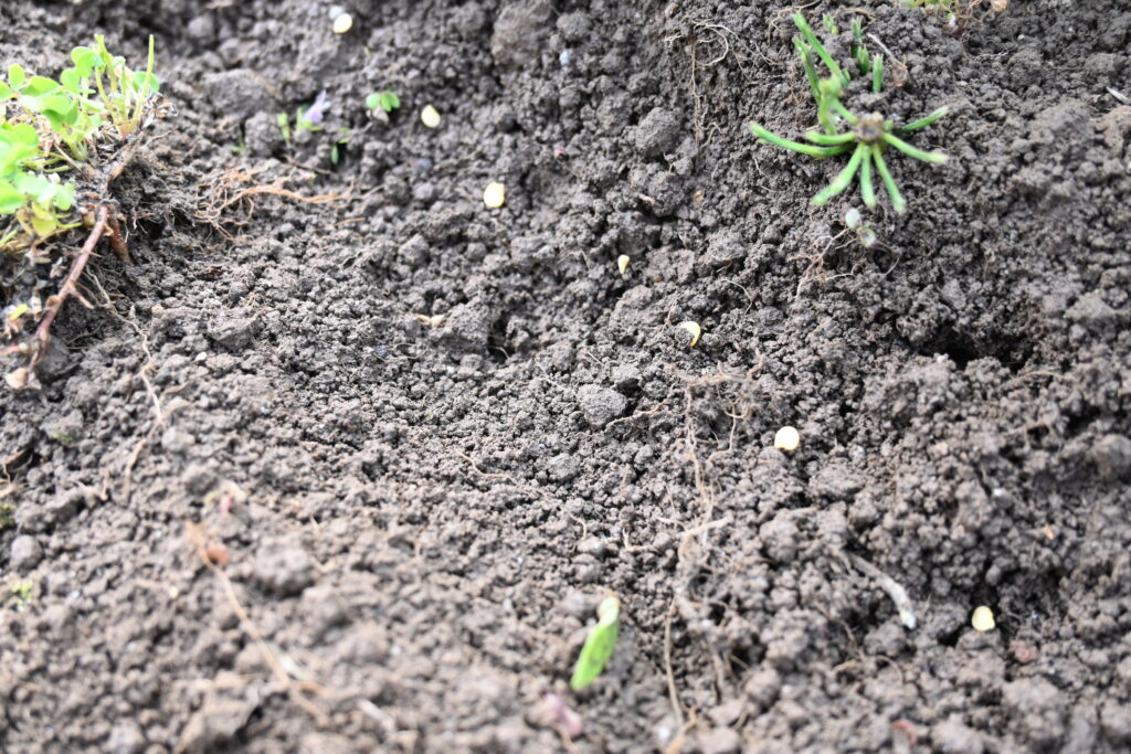 ゴボウとの相性がよきようなので、コンパニオンプランツも兼ねて、まだ土に埋まっているゴボウのお隣に、筋をつくって蒔いてみました。
