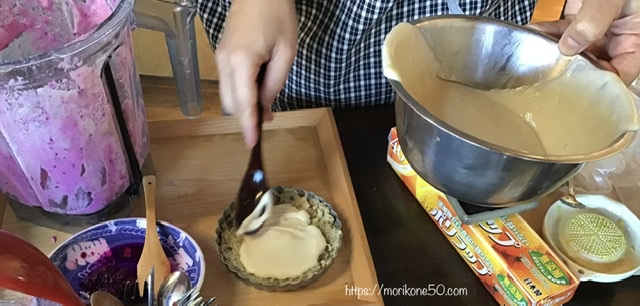 フィリングができ上がったところで、これらを型に流し込んでいきます。