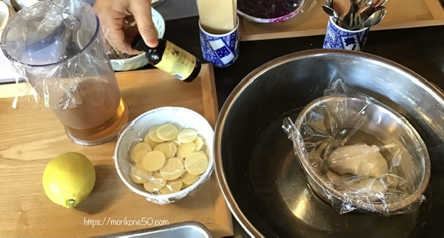 さて、お次はフィリング作り。カシューナッツやシロップ、オイルのほかに、レモンの皮や食べられるエッセンシャルオイルなども使っていきます。