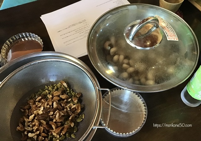 使う材料はこんな感じ↓で、あらかじめ浸水させた生のクルミやカボチャの種、そしてカシューナッツ。